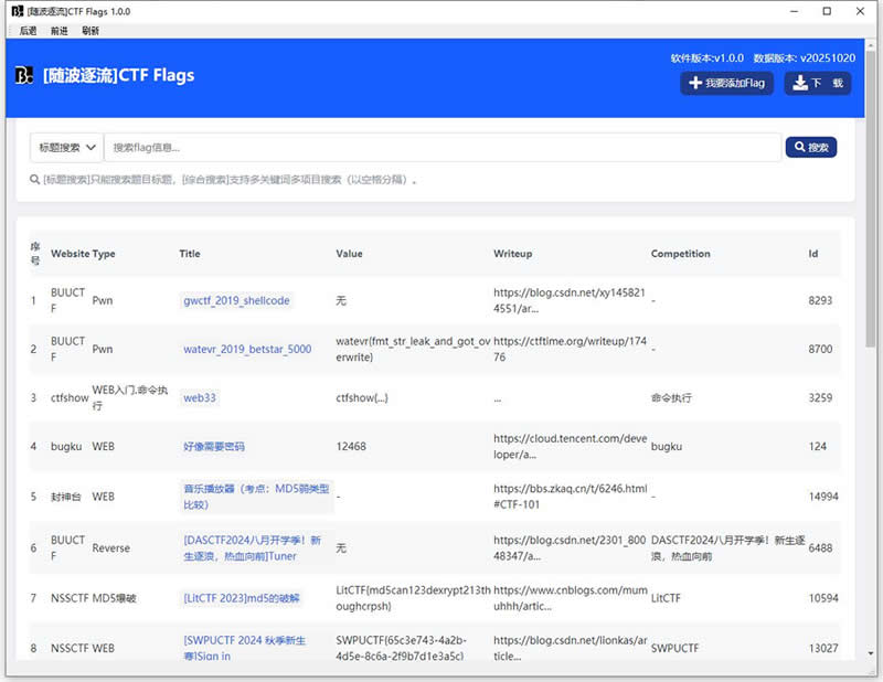 数据库目前只收录了bugku、ctfshow、buuctf、qsnctf、xctf、nssctf、ctfhub、WgpSec的题目,大概有15000多道题目,后期会增加更多网站和赛事题目。